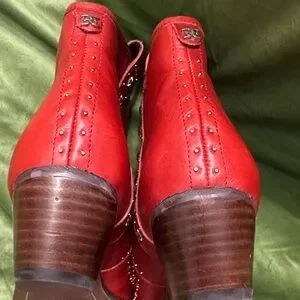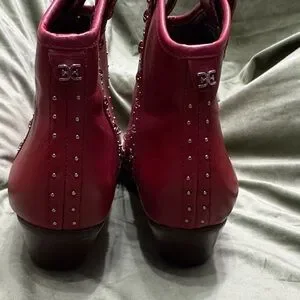 Bold red ankle boots with silver studs. Sleek design. Perfect for a statement look.