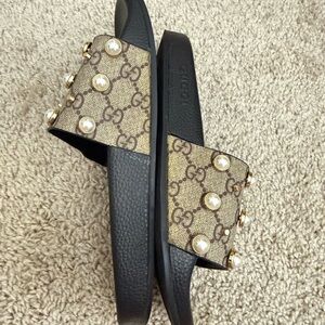 Elegant slides with pearl embellishments. Black sole with tan patterned strap. Perfect for stylish outings. Size 39 but fit more like a 38. Never worn, it was a gift and I don’t know the background to these so that’s why I’m selling low.