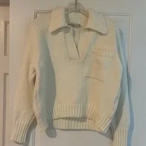 Elegant cream sweater with a stylish V-neck. Features a cozy knit design and a chic pocket detail.