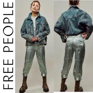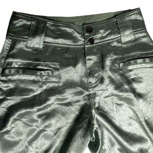 NEW Free People Ryder Pants Metallic Silver Satin Moto Crop Vegan Shiny Green 0