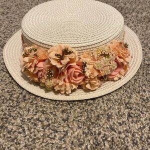 Delightful peach dress for kids, featuring playful ruffles and a matching floral hat. Ideal for casual outings. Great Easter Dress.