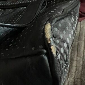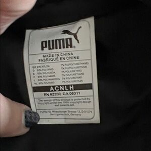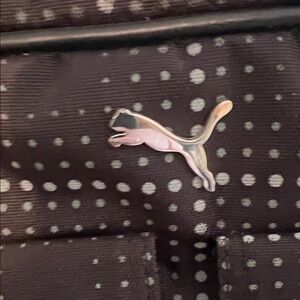Sleek Puma duffel bag in black with gray accents. Ideal for gym or travel. Durable and stylish. 2 front pockets, wide open inside with 1 zipper pocket. Leather handles, leather bottom. Some wear showing on the trim as seen in pictures. I can probably cover with black polish, but wanted you to be aware.
