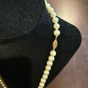 Elegant vintage-inspired faux pearl necklace featuring smooth, luminous pearls and a decorative gold-tone filigree clasp.
