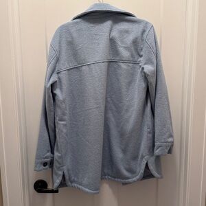 Stylish light blue button-up jacket with front pockets. Perfect for layering.
