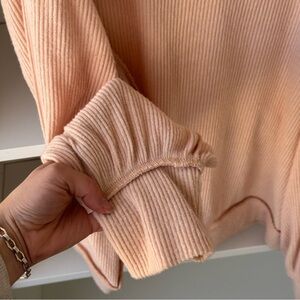 Super soft ribbed top featured in a slouchy silhouette. Wide neckline, can be worn off-the-shoulder. Wide long sleeves. Exposed seam detailing. 27% Rayon, 5% Elastane, 68% Polyester. Great preloved condition. Size large