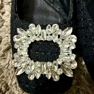 Fabric ballet flats with texture. Rhinestone embellishment at front. Squared toe.