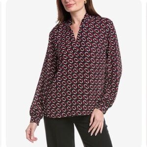 Stylish blouse with a unique pattern. Features a blend of red, white, and black colors.