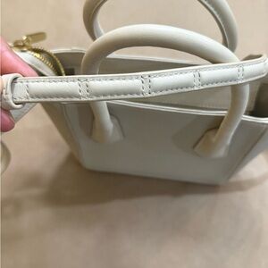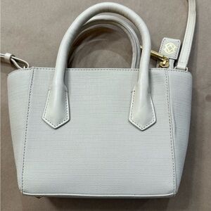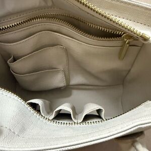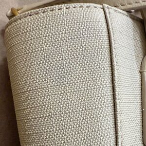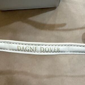 Retired Dagne Dover Tiny Tote in linen. The company's name can be seen on the zipper pull and on the crossbody strap. The hardware is in gold and in good condition. The cross body strap has small padded spots to help weight on shoulder. The handles do not fold down. The bottom of the bag has four gold studs to aid in keeping the bag clean. The inside is clean and has: