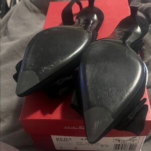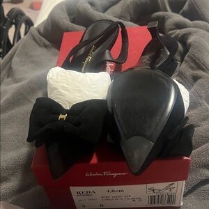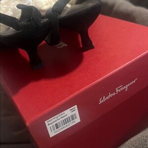 Salvatore Ferragamo Black Suede Heels with Gold Bow Detail