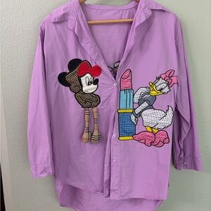 Purple shirt featuring cartoon character patches. Unique and playful design. Handmade, size fits Lg.