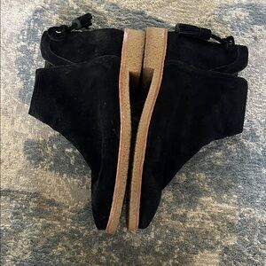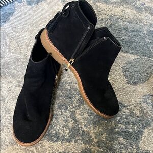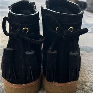 Elegant black booties with a stylish brown sole. Perfect for versatile wear. it is in great condition with working zippers on each shoe. It has small castles with little bows on each boot. It has been worn twice which is seen in the soul of the shoe and on the inside look like they have never been worn at all. Please let me know if you have any questions!