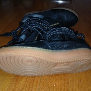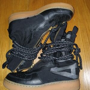Sleek Nike Air Force sneakers. Black design with gold zipper detail. Ideal for a modern look.
