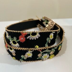 Enhance your outfit with this elegant floral embroidered belt. Featuring a striking gold buckle, this accessory adds a touch of sophistication to any look. Perfect for any occasion. Full length 45 1/2”, first notch 29”, last notch 38”. #belt #floralbelt #bohemianbelt #embroideredbelt #womansbelt