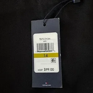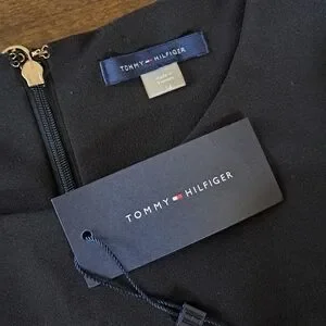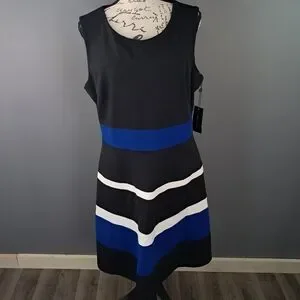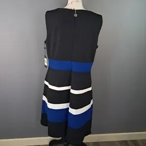 This Tommy Hilfiger women's sleeveless dress in size 14 features a stylish colorblock pattern in blue, black, and white. The knee-length dress has a fit & flare style with a round neck and zip closure. Made of polyester and spandex, this dress is perfect for a colorful and fashionable look. Ideal for any occasion, this Tommy Hilfiger dress exudes quality and style synonymous with the brand.