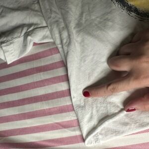 This shirt is preloved and has a slightly worn-in look, so it's not as bright white as it once was—but it's still super cute and full of character. There's minor pilling and 1–2 tiny, untreated marks that are only visible under a flashlight. A fun, playful top with plenty of life left!