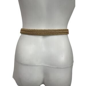 Braided beige linen belt featuring a polished gold-tone square buckle and keeper. Hardware shows light surface scratches.