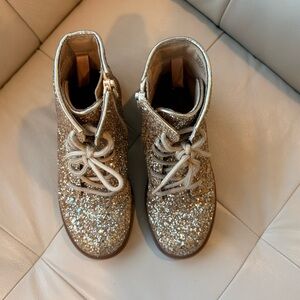 Add a touch of sparkle to your child's wardrobe with these glittery gold boots. Perfect for any occasion, these boots offer both style and comfort. Inner zipper. Functional laces. Some glitter has fallen (see close up), but these boots are still very attractive and wearable.