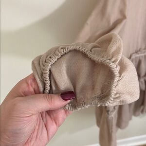 Chic taupe blouse with layered design. Features subtle ruffle accents. Ideal for versatile styling.