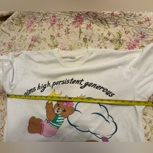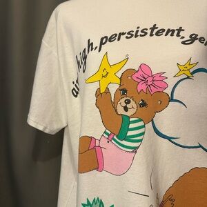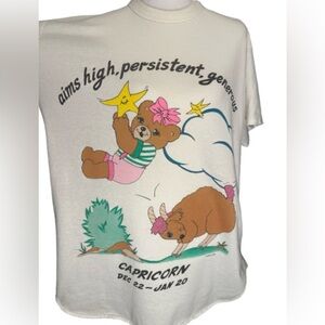 Rare 1980s Capricorn zodiac sleep tee featuring cheerful illustrated bear and goat artwork with traits reading: “aims high, persistent, generous.” Dated Dec 22 – Jan 20.