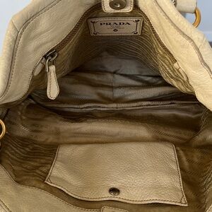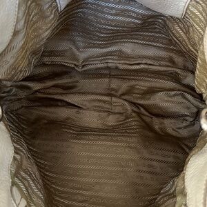Beautiful Prada supple premium Cervo lux leather 2-way tote bag in ivory (“talco”) with rare 2-toned hardware in both gold & silver AND expandable zip compartment that extends all the way around the bottom of the bag. ZIP compartment also features two-toned zippers!