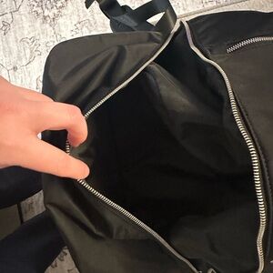 Unisex, sleek and versatile black backpack, perfect for everyday use, gym, work, going on trips. Has a bottom pocket, main compartment with pocket inside, top pocket and side pocket. Adjustable straps with silver hardware. Never used before.