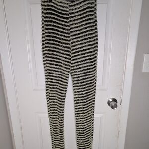 Cozy fuzzy pants with black and pale yellow stripes. Perfect for lounging.