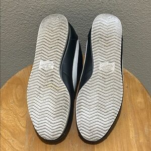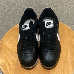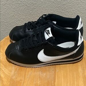 Classic Nike design with black body and white swoosh. Comfortable and stylish for any occasion.