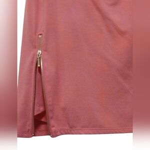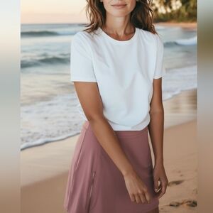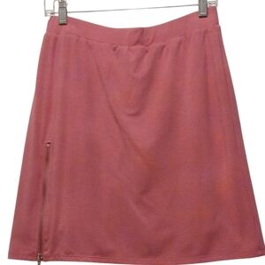 The product is a stylish Serena Williams pink skort in size M, perfect for activewear occasions. Featuring a working zipper in the front and an elastic waist for comfort, this skort is made of a blend of polyester, spandex, and rayon. The athletic fit and mini skirt length make it suitable for various activities such as tennis, walking, and beach outings. Machine washable and in a vibrant pink color, this skort adds a touch of designer flair to your wardrobe, ideal for summer, fall, and spring seasons.