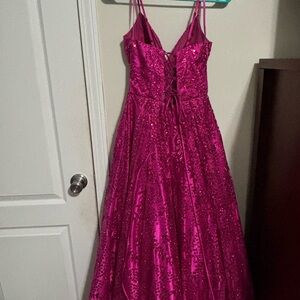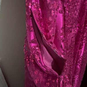 Vibrant fuchsia dress with sparkling sequins. Ideal for glamorous events. My daughter wore it for a couple of hours to her winter formal. IT HAS POCKETS!!