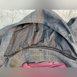 • Outer Layer: The main coat is made of wool and features a plaid pattern.
