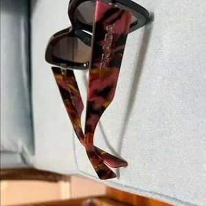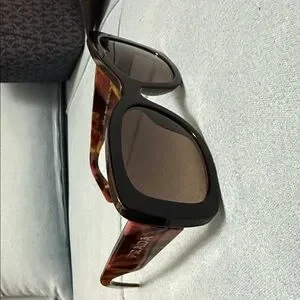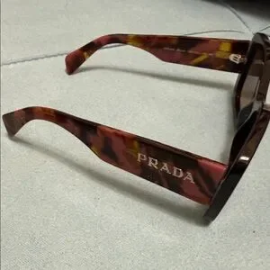 Stylish Prada glasses with a red and brown pattern. Elegant design for a chic look.