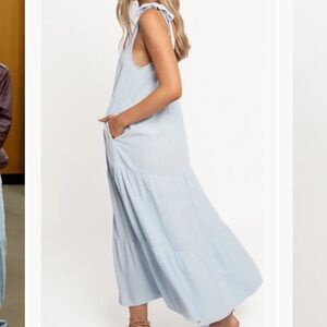 Elegant light blue midi dress. Features tie straps and tiered design. Perfect for any occasion.