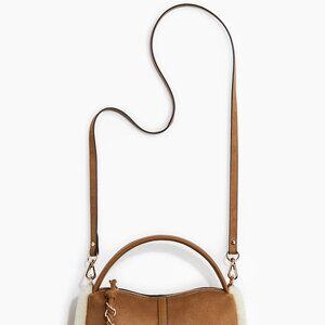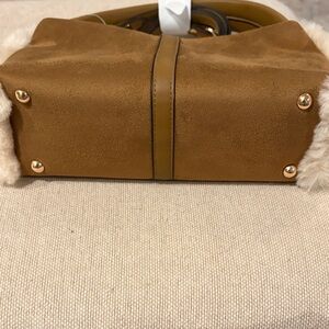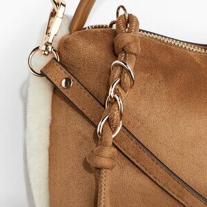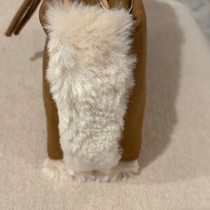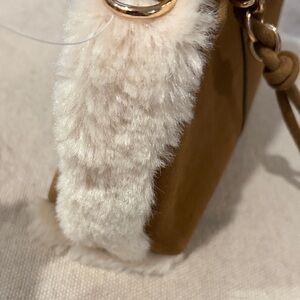 Small, cute bag with rounded handle or a crossbody strap. Both sides of the bag have soft, faux fur detail. Tassled zip-top closure.
