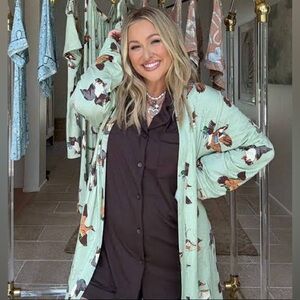 Stylish green robe featuring a vibrant bird print. Perfect for lounging.