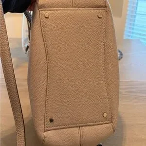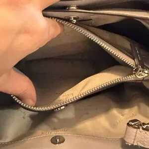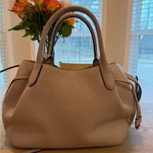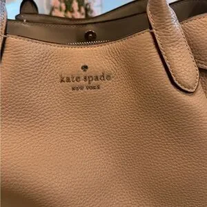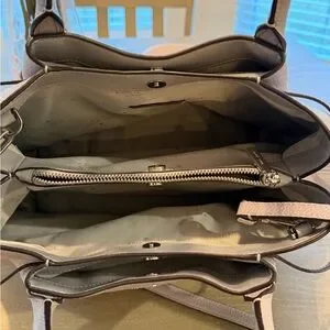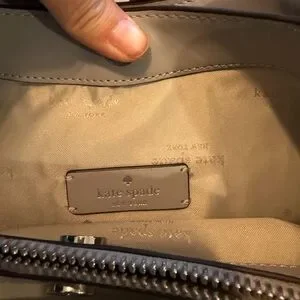 Excellent used condition light grey Kate Spade purse. No scratches, stains, or marks on outside leather. Inside is also in excellent condition, no stains, just smudges from putting items in and out of bag. Lots and lots of pockets for storage. Can hold a tablet in larger pockets. Zipper middle pocket and adjustable strap that can be worn with or without. I just didn’t use this bag the way I thought I would, nothing wrong with it! Smoke free home! Quick shipping!