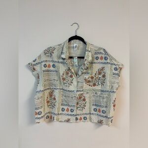 - ALINE TOP; Cut in a lightweight Desert Tile print, this button-up Aline blouse features banded short sleeves and a notched collar. The muted orange florals combined with blue and sage green graphic details, create a unique and eye-catching look. Finished off with a high-hip hemline, this top offers a youthful aesthetic.