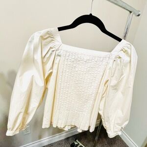 Chic cream blouse with textured front. Square neckline and puff sleeves. Versatile and stylish.