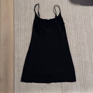 Sleek black mini dress. Spaghetti straps. Built in biker shorts. From a smoke free home.