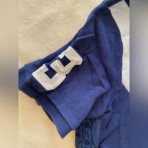 Navy polo featuring a bold embroidered emblems. Iconic Ralph Lauren classic fit style. Number 3 on the sleeves. In good used condition with some life left. No major holes or stains but collar could be refitted.