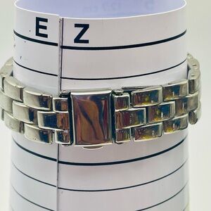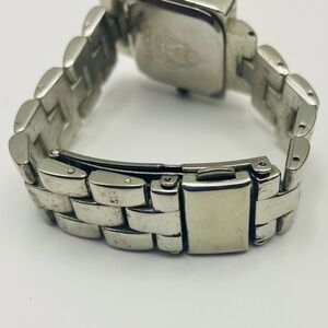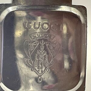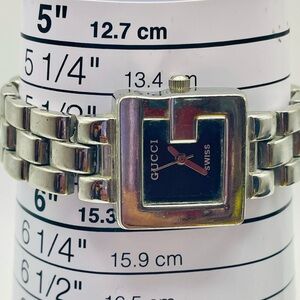 New battery. Working. Elegant Gucci watch with a rectangular face. Silver band complements the black dial. In good condition but has some scratches visible in the photos. Please note the size of this item. This fits a small wrist.