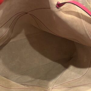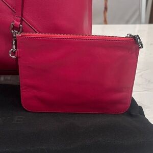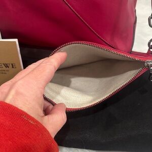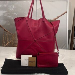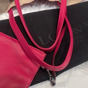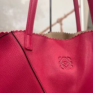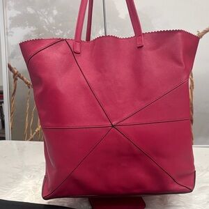 Elegant Loewe tote in striking raspberry pink leather. Features geometric pattern. Comes with matching removable pouch, purse pillow and dustbag. Soft calf leather. Notable for unique geometric panels and ability to fold flat, similar to traditional origami. Excellent condition