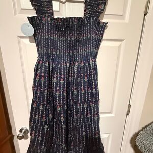 Charming navy dress with smocked bodice. Features colorful floral patterns. Ruffled sleeves add elegance. xxxxl.