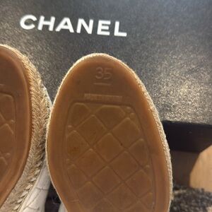 Step out in style with Chanel's elegant quilted espadrilles. Featuring a luxurious gold and cream design, these shoes offer both comfort and sophistication. Perfect for any occasion.
