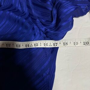 Chic faux wrap design with elastic at the sleeve shimmering material. Perfect for any event. Vibrant royal blue color.