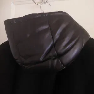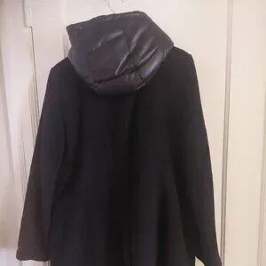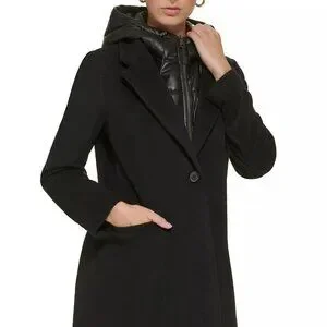 NWT DKNY Black Wool Faux Leather Hooded Bibbed Mixed-Media Blazer Coat XL