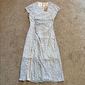 Charming blue floral midi dress. Features a subtle slit. Perfect for casual elegance.