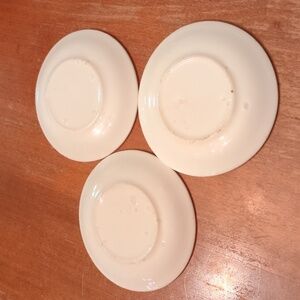 In very good condition with varying degrees of wear, particularly around the gold painted trim. One plate has a very small chip. Please study photos carefully before purchasing! 3.25" in diameter.