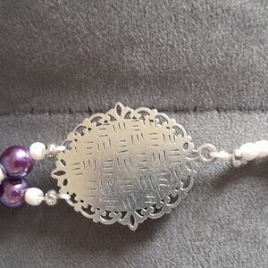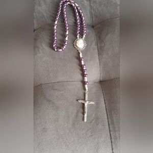 Handmade by me. features faux purple pearl 8mm beads with white seed beads . Mary with infant Jesus cameo rosary center, silver crucifix. strung on c lion cord.
