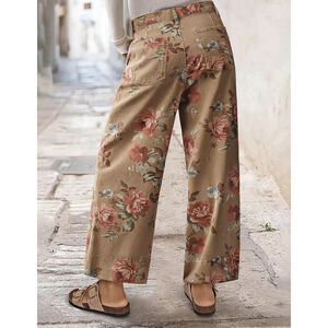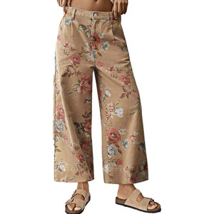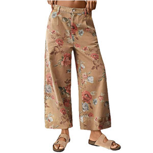 Features: Cropped pants, relaxed fit, floral print, elegant, boho, casual. Mid waisted design offers a comfortable fit and flatters the figure. Wide leg silhouette provides a stylish, relaxed look. Floral print adds a vibrant, feminine touch. Ankle length is trendy and suitable for various footwear.