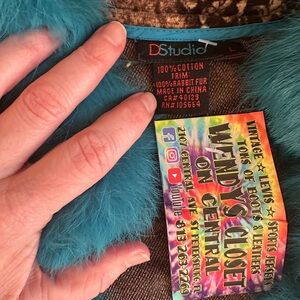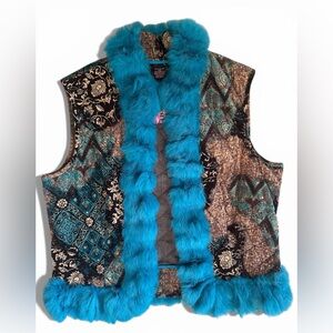 Size is L but I would say it fits like a women’s medium. Rabbit fur teal trim. Features intricate paisley patterns. Ideal for a bold look. Tags still attached from vintage shop I purchased from.